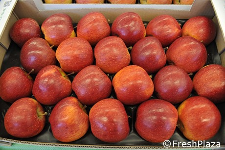 Apples are similar to the Fuji variety, i.e. have a deep red colour on most of the skin with streaks. Shape is regular and grades are homogeneous. Shelf-life is excellent.