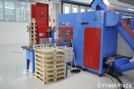 It is a pressing machine that, thanks to its simplicity and versatility, can be used for both crates with handles and polystyrene trays. It can process up to 800 crates/hour - no other manufacturer can obtain such a high production using a single machine.