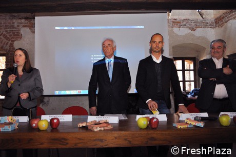 The speakers' table. From left: Rossella Gigli (FreshPlaza Italy), Giovanni Ghigo (Lagnasco Group president), Davide Brero (Lagnasco Group vice-president), Giuseppe Termanini (Lagnasco Group director).