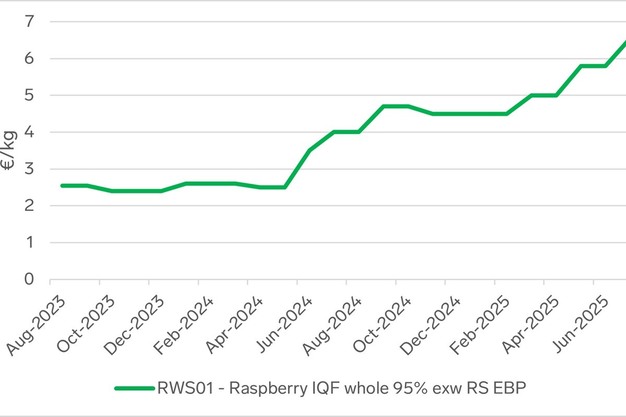 On July 31, Expana Benchmark Prices for IQF raspberry whole 95% EXW Serbia stood at €6.55/kg, up 13% month-on-month and 64% year-on-year, reflecting the tight supply.