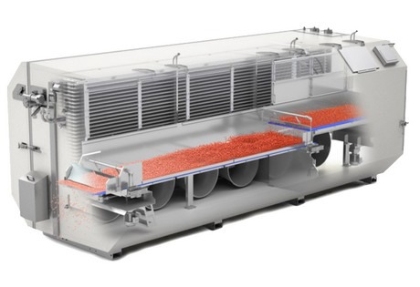 The adjustable speed of fans in the OctoFrost IQF tunnel is one of the unique features of the line. "This option means that the strength of the airflow can be set stronger at the infeed of the freezer, for quick crust freezing. If the airflow is set at a stronger level in the beginning of the freezing process, moisture is locked inside the berries, which results in minimal loss of hydration and the prevention of any cracks or burns on the surface of the sensitive berries like raspberries and blueberries."