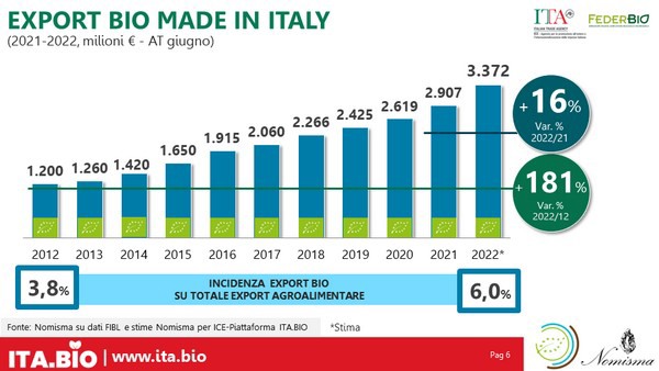 Compared to last year, Italy's organic exports have kept up their momentum. In 2022, sales of Italian organic agri-food products on international markets reached 3.4 billion euros, setting a growth rate of 16 percent (year ending June). The recognition of organic made-in-Italy brand on international markets is also reflected in the long-term growth (+181% compared to 2012, a value almost tripled) and the export share (weight of 6% on total Italian agri-food exports in 2022 compared to 4% ten years ago).