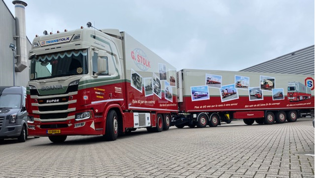 The Dutch transport company, Transtolk isn't letting its 60th anniversary slip by unnoticed. They have a special, limited-edition anniversary truck on the roads. The Scania combination has a V8 engine and 770 HP. It's the most powerful truck currently available ex-factory. So, it can rightly be called a King of the Road. This vehicle features images of the trucks the company has had over the past 60 years.