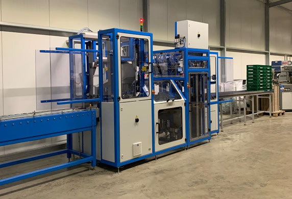 "One that automatically places the inlay/inserts into the unfolded boxes." Placing these inlays by hand is just as time-consuming and tedious as unfolding the crates. Reintjes Systems accepted the challenge and, within a few months, developed the first innovative inlay module.