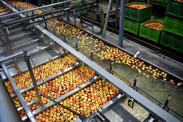 Once the optical sorting and grading operations have been completed, the apples are packed on 7 packing lines. Each line can load 8 pallet boxes. The 5 to 10% of the apples that are rejected from the packaging circuit are once again automatically either rejected to a pallet of rejects that are weighed in time, or taken to the skip for rotten apples, thanks to a network of underground pipes, where the operation previously required human intervention. It is a way of making savings across the board, and not "incurring costs for fruit that does not make any money." The fruit leaving the packaging lines is then dried and brushed using a brush and ventilation system. They are then packed dry, shiny and scrubbed without the use of any chemicals. Several packaging machines are then used to meet the needs of each client. The palletizing system has been designed so that there is never a break in the load, which again saves considerable time.
