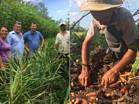 Left: Managing director Sascha Suler (middle) together with farmers in the ginger field - Right: A small farmer with turmeric.