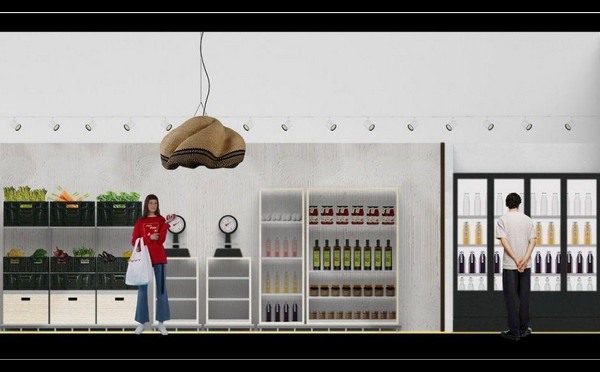 The new local shop format designed by Francesco Faccin for EcorNaturaSì, channels the 40x60 module of the crate used throughout the agricultural chain to cut waste and boost circularity
