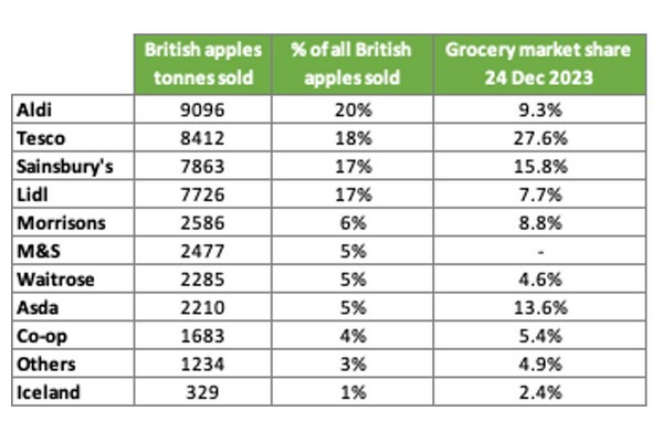 Tesco did top the chart for British apple sales in November (3,104 tonnes) and December 2023 (3,582 tonnes), but that wasn’t enough to beat Aldi's consistently high performance over the first quarter of the new season.