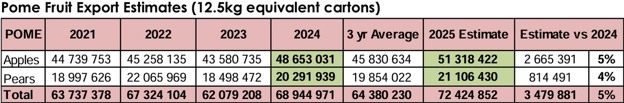 The 2024 apple export season ended on a high, reaching 48.6 million equivalent cartons (12.5kg), an increase of 12% compared to the 2023 season. The initial estimate for the 2025 export season indicates a 5% increase in 2024 volumes. The growth in export volumes is attributed to increased production due to young orchards coming into production, higher-yielding varieties, and the recovery from the 2023 hail and flood impacts, as well as more favorable weather conditions.