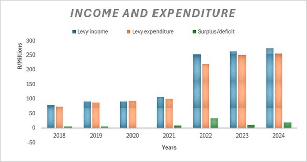 Between 2018 and 2024, levy income in South Africa's citrus industry increased by an average of 247.85%, reflecting significant growth in financial capacity to support sector-wide initiatives. These agricultural statutory levies, approved by the Minister of Agriculture for a four-year cycle, are used to support key industry functions such as research, transformation, and export development. Surplus levy funds not utilised within three years may still be used within the four-year term, pending ministerial approval.