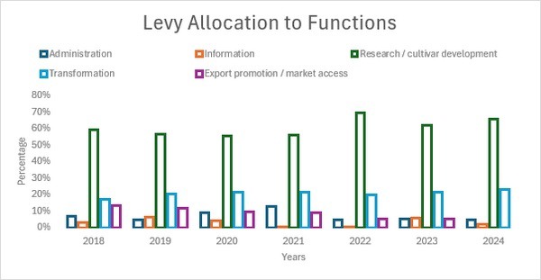 By 2024, 66% of collected levies will be allocated to research and the development of export markets. Transformation efforts also received increased support, with funding rising from 22% in 2023 to 23% in 2024. These investments underscore the levy's role in driving innovation, supporting new agricultural techniques, and advancing disease control strategies. In addition to research and transformation, the levy funds are used for administration, export promotion, market access, and information distribution.