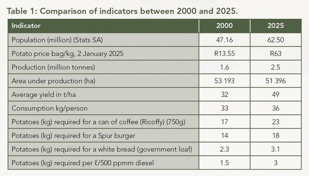Average production costs for irrigated potato fields stand at R240,000 per hectare (US$13,090). Producers report narrowing margins as break-even prices tighten under climate variability and consumer pressure. In 2000, South Africa produced 1.6 million tons of potatoes on 53,193 hectares at 30 tons per hectare. Today, output has increased to 2.5 million tons on 51,396 hectares at 49 tons per hectare. Per capita consumption has risen from 33 to 36 kg, while the population has grown from 47 million to over 62 million.