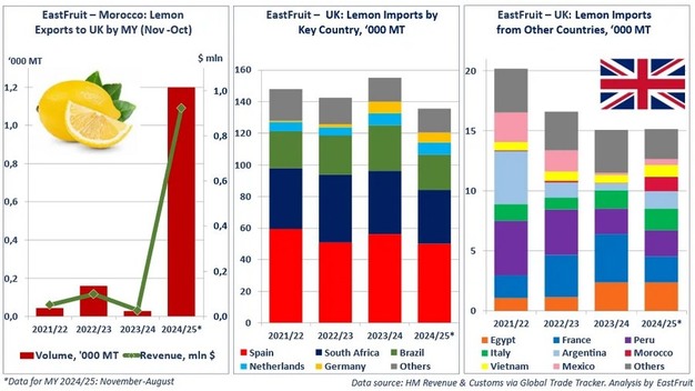 EastFruit analysts report a sharp increase in Moroccan lemon exports to the United Kingdom between November 2024 and August 2025. During this period, Morocco shipped 1,200 tons of lemons to the UK, valued at US$920,000. The exported volume was 40 times higher than the previous marketing year and exceeded the country's total lemon exports to the UK over the past decade.