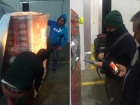 Left: workers move the cherries to refrigerated storage facilities at the airport