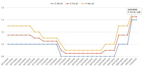 As the graph above illustrates, first category Italian white cauliflower packaged in 8-pieces boxes (40x60) went from 0.85 euros/kg (as of 31 December) to 1.45 euros/kg (as of 11 January 2019), at the Turin’s Caat.