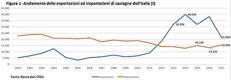 "In 2018, the main destination for Italian chestnuts was France with a little over 3,000 tons, followed by Germany with around 2,800 tons, Switzerland with 2,200 tons and Austria with 1,500 tons."