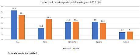 The main European producers are Turkey (29.3%), Italy (24.3%), Greece (16.7%), Portugal (13.9%) and Spain (7.3%). Fao data on Italian production are based on historic data, as Istat has not been collecting data on the domestic chestnut production since 2008. They therefore do not represent the current situation of the Italian production.