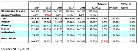 Based upon a provisional estimation of the NEPG (North-Western European Potato Growers) the area in the 5 largest potato countries increased to 609.000 ha of consumption potatoes. The largest ever. Although it is not the final area figure (final figures will be published at the beginning of July), the estimations show a growth of 2,4 % compared with last year and 8,4 % compared with the 5 years average. All potato countries on the continent show growth, with France and Belgium at the top. The fear for lack of seed potatoes to grow to more area was not so realistic (more smaller sizes used, more seeds cut) even if prices have increased. Also production costs, due to higher seed costs and sometimes higher land rents, will probably be higher than those of last year. For Great Britain it is still too early to make a first estimation, so here has been calculated with the 5 years average. However, any growth in area may be capped by last year’s challenging season and high seed prices.