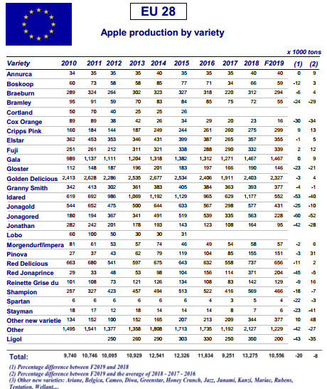 The Golden Delicious remains, by far, the largest apple variety in Europe. It is expected that 2,327,000 tons of these apples will be harvested this year. This is three percent less than last year. At 1,467,000 tons, Gala estimations are exactly the same as last year. The European Elstar harvest will also be roughly equivalent to last year. A volume of 355,000 tons of this variety is expected.