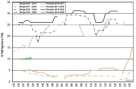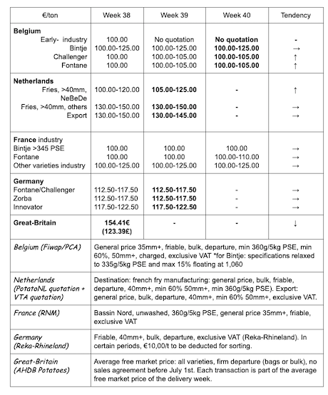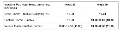 For the industry, the low point of the market is at 10 €/q for “basic” varieties (including Fontane and Challenger), and at 12-12.5 €/q for Innovator. Some industrials are buying on a market qualified as stable where prices have been unchanged for several weeks. On the fresh market, soft flesh varieties are between 18 and 25 €/q, and firm flesh varieties are between 30 and 45 €/q, depending on washability and variety. In export, Spain, Italy and Eastern Europe are interested but 30 to 40% of the French plots have been grubbed (estimation UNPT on September 25th).