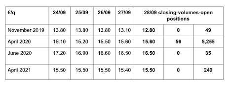 EEX in Leipzig (€/q) Bintje, Agria and var. related for conversion, 40 mm+, min 60% 50 mm+: