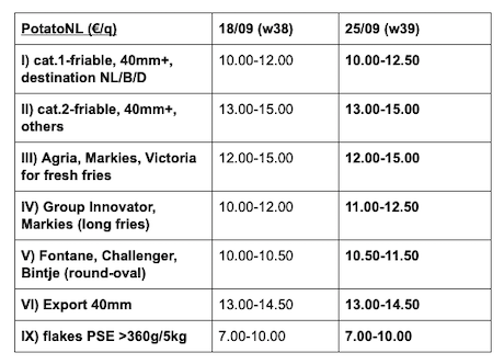 Little pressure from the offer despite the beginning of the harvest. But the industrial demand is not very high either, so not much is happening. Prices remain between 10 and 12.50 €/q for basic industrial varieties. Agria and similar varieties have the highest prices (up to 15 €/q). Domestic trade (promotional actions by retailers) is going well, with a producer price going from 13 to 24 €/q (mostly soft flesh varieties). Export (Africa and Eastern Europe) is quite active, at 16 to 18 €/q (calibrated in bags/big-bags, departure preparer).
