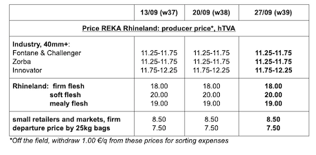 Large retailers have been extremely active these last 2 weeks with “Sonderaktionen” (special actions) to boost sales at the beginning of the autumn season. The very low prices - from 0.33 to 0.36 €/kg - should stimulate sales and consumption. We also notice that the bags keep getting smaller (the bags of 15kg being replaced by bags of 10, 2.5, 2 or 1.5kg…). The fresh market is slightly down, with firm flesh at 19.50 €/q (compared to 19.67 €/q last week), and soft and mealy flesh at 18.38 €/q (compared to 18.50 €/q). The demand from Eastern and Southeastern Europe continues.