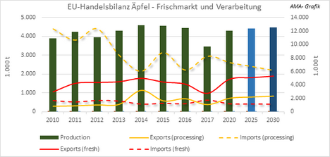 The forecast models expect European apple production to grow to an average of 12 million tonnes per year by 2030. The modernisation and mechanisation of plants will continue to be advanced and old stocks will increasingly be converted in favour of more competitive varieties. Exports of dessert apples are expected to grow by 0.7 %/year, while imports will remain constant at about 500,000 t/year.
