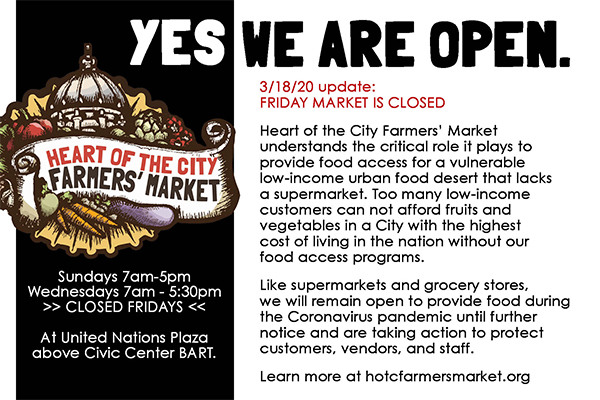 "Too many low-income customers cannot afford produce in a City with the highest cost of living in the nation without our food access programs", the team with Heart of the City Farmers’ Market in San Francisco says, explaining how they have a critical role to provide food access for a vulnerable low-income urban food desert that lack a supermarket. "Like supermarkets and grocery stores, we will remain open to provide food during the Coronavirus pandemic until further notice with special measures incorporated."