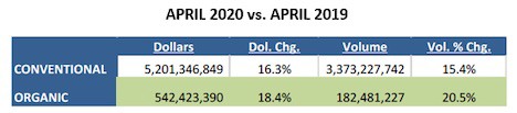 Overall, organic sales in April increased by 18.4 percent in dollars, and 20.5 percent in volume from April 2019, while conventional produce dollars increased by 16.3 percent and volume was up 15.4 percent.