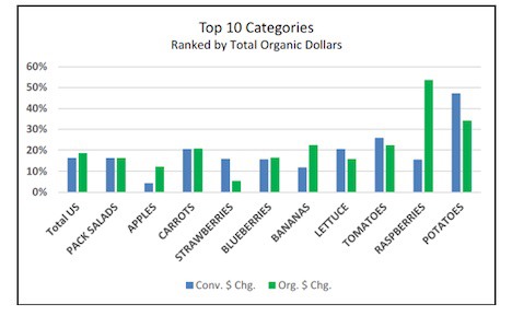 The top 10 categories for organic volume drove 72 percent of total organic movement, with the big four ----packaged salads, carrots, apples and bananas----responsible for more than half (52 percent) of the total organic retail volume.