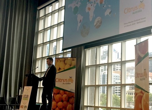 Photo: Gordon Fisher explaining Oritain's services at the Citrus Outlook Forum in Melbourne