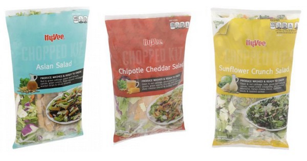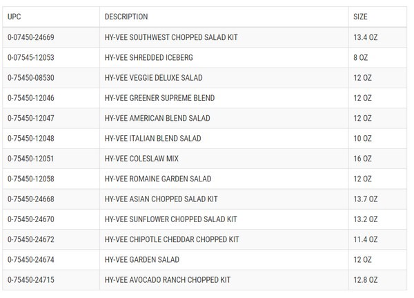 The 12 salads are in addition to the 12 oz. Hy-Vee Bagged Garden Salad product that Hy-Vee pulled last week after initial notification of the investigation. Hy-Vee now has 13 private label bagged salad products (all expiration dates) that are being recalled as a result. The products were distributed to Hy-Vee grocery stores across its eight-state region of Iowa, Illinois, Missouri, Kansas, Nebraska, South Dakota, Minnesota and Wisconsin.