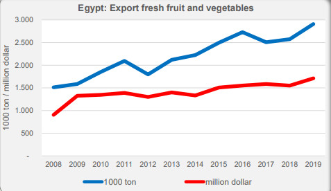 The value of Egypt's fresh fruit and vegetable exports is estimated to be approximately $ 1.7 billion in 2019. That is 6% of the total Egyptian goods exports of $ 30.6 billion. Egypt imported nearly 300,000 tonnes of apples in 2019. Especially from Poland, Italy and Greece. And also smaller quantities, such as plums, peaches and kiwis.
