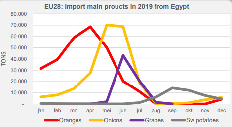 Egypt is a major orange exporter. Based on import data from all countries, this concerns approximately 1.4 million tonnes. With that amount, Egypt plays well on the world market for oranges. The Egyptian export season for oranges starts around the turn of the year and continues until the beginning of July with a peak in March-May. During that period, Egyptian oranges in the EU had a share of over 20%. Spain dominates the EU market with a share of more than half. In total, 210,000 tonnes of oranges from Egypt were imported into the EU throughout 2019. That was less than the 255,000 tonnes in 2018. In the Netherlands, 117,000 tonnes of Egyptian oranges were imported in 2019 compared to 136,000 tonnes in the previous year. This year, 20% more Egyptian oranges were imported into the Netherlands in the first four months than in the same period of 2019.