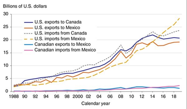 Agriculture has a large and growing stake in interregional trade in the free-trade area created by NAFTA. The total value of intraregional agricultural trade (exports and imports) among all three NAFTA countries reached about $95.3 billion in 2019, compared with $16.6 billion in 1993 (the year before NAFTA’s implementation).