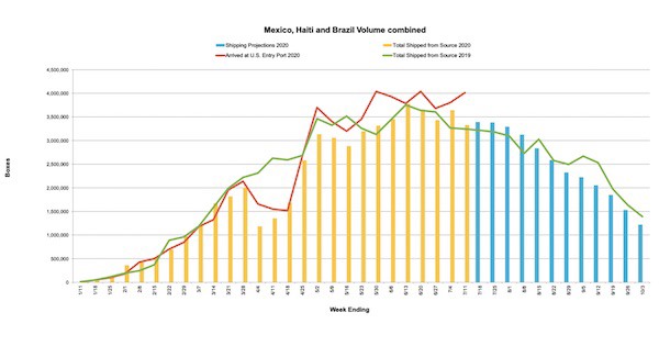 Mexico has so far shipped a total of 51,087,417 boxes for the season, with a projection of 76 million boxes for the entire season. Haiti has shipped a total of 2,445,084 boxes so far for the season, and has projected a total volume of 2.7 million boxes for the season. The overall mango volumes shipped from week 29 (7/18/2020) to week 40 (10/3/2020) are expected to be 2% lower year-over-year, with arrivals expected from week 30 to 41. Mexico's volume for the season is projected to be about 5% lower, year-on-year, but the volume from Haiti is projected to be 40% higher, year-on-year.