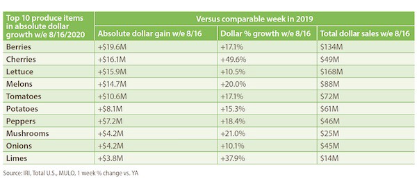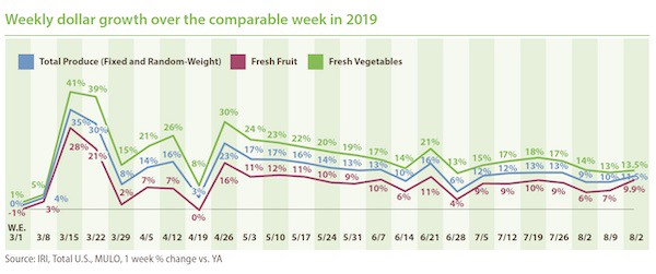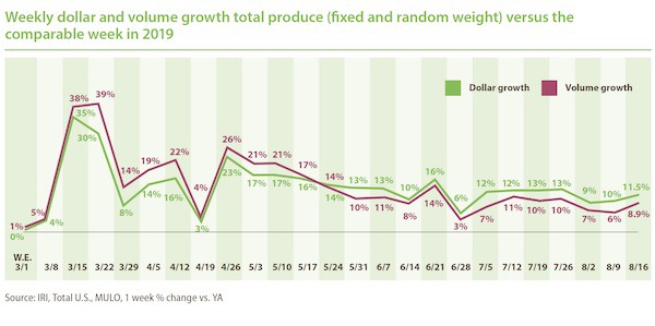 Between January and August 16, produce sales in calendar year 2020 are $4.5 billion ahead of 2019 sales, with an additional 2.9 billion pounds of fresh produce sold. Fresh produce appears to be settling into an everyday demand pattern that sits about 10% above last year’s levels. For the week of August 16, fresh fruit and vegetable sales increased 11.5% over 2019 — jumping back into double-digit increases.