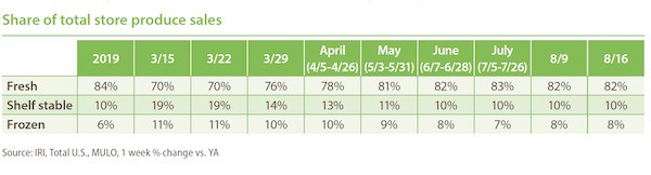 The fresh produce share of total fruit and vegetable sales across all three temperature zones was 81.9% during the week ending August 16. After falling to as low as 70% of total fruit and vegetable dollars across temperature zones, the fresh share had made a full comeback to its typical 84% during Independence Day week — a big week for fresh produce. “