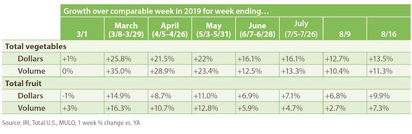 “During the week of August 16, we saw a strong performance of summer fruits and the smallest performance gap between fruit and vegetables we have seen in a long time, at just 3.6 percentage points,” said Jonna Parker, Team Lead Fresh for IRI.