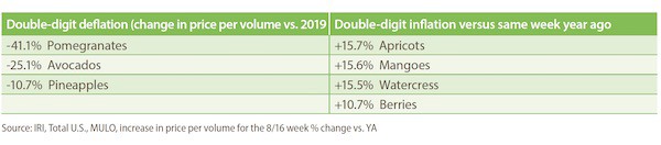 While overall produce inflation was relatively mild at +2.4% versus 2019, supply and demand imbalance caused double digit gaps in dollar gains and volume gains in either direction. Ample supply drove double-digit deflation for items such as pomegranates, avocados and pineapples. On the other hand, dollar gains far outpaced volume due to double-digit inflation for items such as apricots, mangoes and berries.