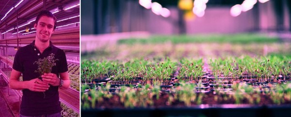 The room is illuminated with violet-colored LED bulbs, and the containers holding the herbs are stacked, one atop the other. This can clearly be considered vertical farming. This concept is gaining increasing popularity among farmers - especially those who grow herbs, leafy and micro vegetables, and edible flowers.