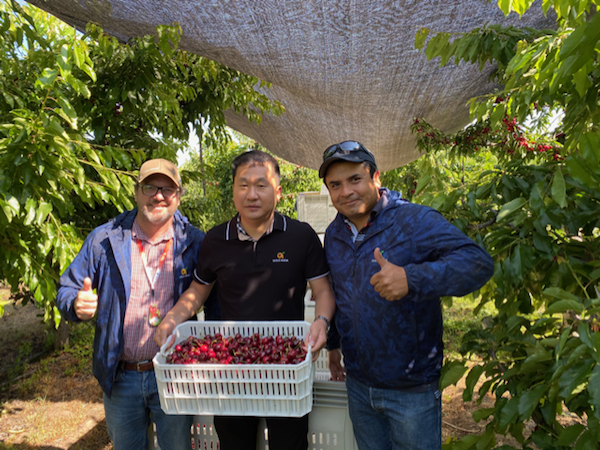 CEO Xie Jinshan inspects cherries in a Chilean cherry orchard