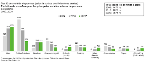 The Braeburn and the Topaz have held it up well, unlike many others that have been declining for a long time, such as the Jonagold, Boskoop, Gravenstein, Maigold, Idared or Cloche. Other varieties have escaped this falling trend, namely the Scifresh, Milwa and Cripps Pink, which were actually almost irrelevant in 2002. Note the extraordinary growth experienced by the Rewena, which has gone from 5.5 hectares in 2019 to 94.9 hectares in 2020. The list of varieties and cultivated areas is published on OFAG's website: Statistics of fruit production.
