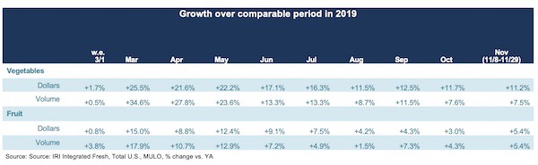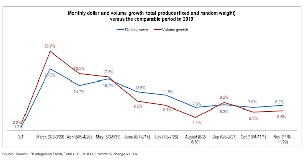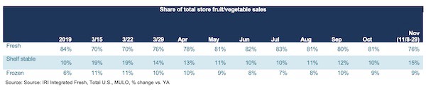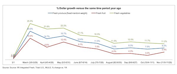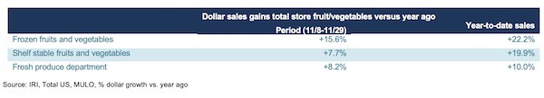 As seen throughout the pandemic, frozen fruits and vegetables have the highest growth, but are also the smallest of the three temperature zones in retail. Frozen fruit and vegetable sales increased 15.6% in November versus year ago versus 8.2% for fresh produce. The 8.2% gain for fresh produce was slightly higher than the 7.5% during the October weeks and gains year-to-date remain unchanged at +10.0% versus the same time period in 2019.