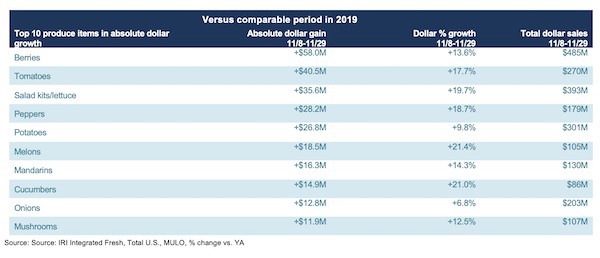 “The November Top 10 in absolute dollar gains reflects some familiar faces, led by berries, tomatoes and lettuce,” said Watson. “Mandarins make an appearance in the top 10 instead of oranges as people’s Vitamin C immune-boosting fruit of choice, with a 14.3% increase versus year ago, reflecting an additional $16.3 million in sales. Cucumbers and mushrooms are the smallest of the categories making it into the top 10, with mushrooms having been a retail powerhouse since March.”