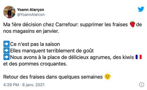 On January 6th, Yoann Alarçon shared on Twitter his first decision as the Manager of Traditional and Fresh Products at Carrefour, which is to eliminate the strawberry offer in January in all Carrefour supermarkets.