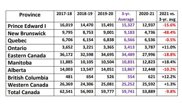 Total Canadian Potato Storage Holdings on February 1, 2021 are 9.8% below the 3-yr. average, down 5.9 million hundred weight. New Brunswick leads the decline at 48% less than 3-yr. averages. Manitoba has storage holdings 18.4% above historical averages but has been importing potatoes until just recently.