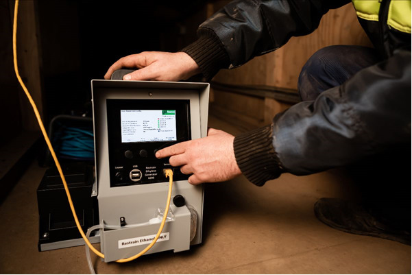 Ethylene is a colourless, volatile gas that you cannot smell at low concentrations. In theory, the gas is dangerous at high concentrations, but Restrain's generators are not technically capable of reaching those values. The ethylene concentrations Restrain works with are extremely low and therefore safe. The ethanol that serves as input for the generator, however, is flammable. Therefore, please take into account that you must not use fire or smoke near the generator and in the storage room.