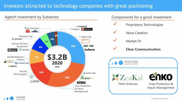 To start off, Ingrid provided an overview of the AgTech investments over the past years. “Finistere Ventures is an early stage AgTech investment fund, which means we invest into start-ups that have technology in agriculture. Over the last 10 years, AgTech investment has shown incredible growth, going from less than a 100 million invested annually to about 3.2 billion invested over the first three quarters of 2020. A lot of this growth has to do with generalist investors moving into the space and an increased interest from private equity groups and pension funds to invest in agriculture with a sustainability lens.”